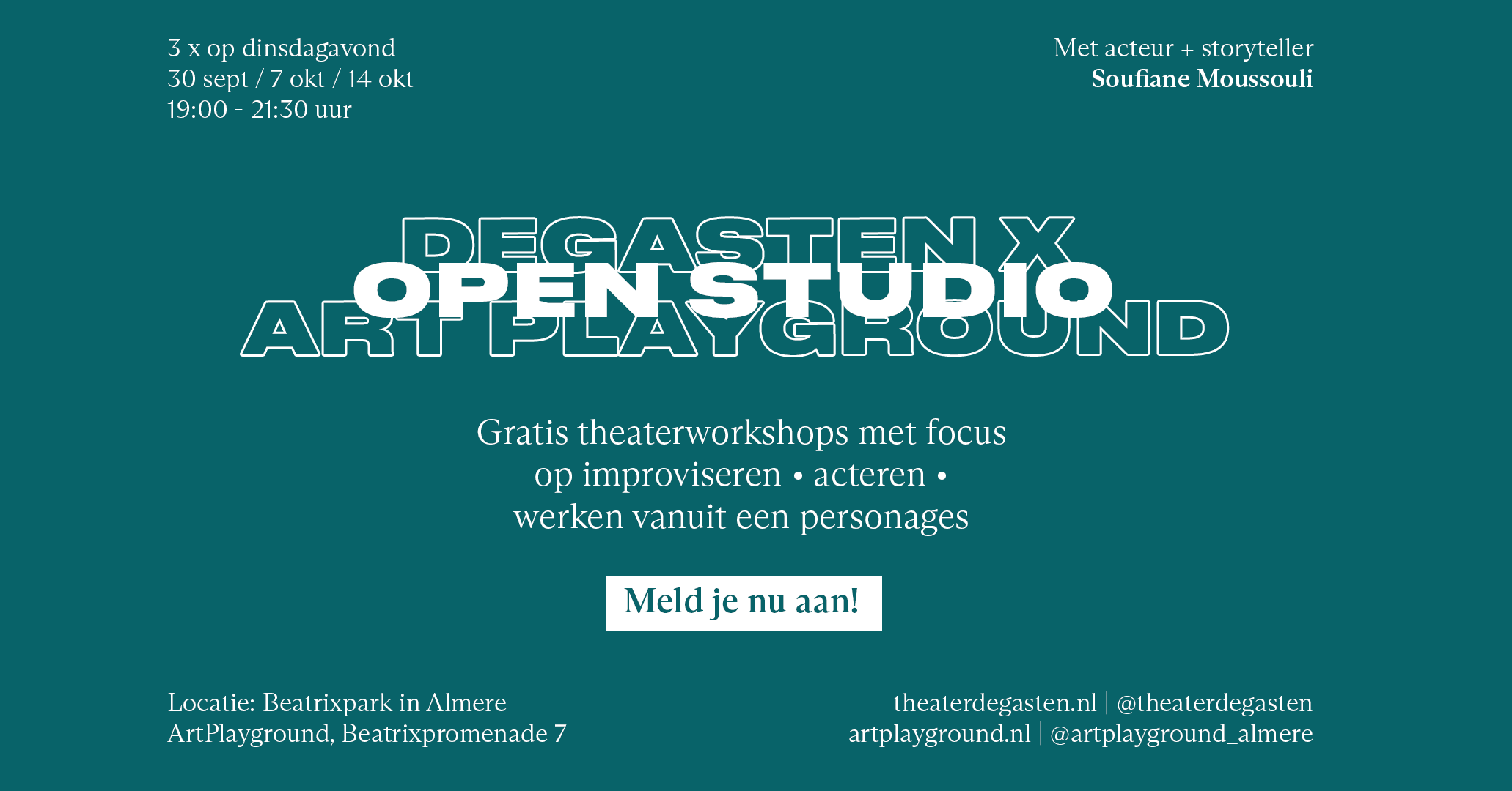Wil je acteren en theater maken? Ben je tussen de 13 en 31 jaar? Kom naar de OPEN STUDIO van DEGASTEN x ART PLAYGROUND, met acteur & storyteller Soufiane Moussouli. OPEN STUDIO is een reeks van drie lessen waarin je theater maken en spelen een keer kunt uitproberen. Denk aan improvisatie, werken met tekst, en vrij spel.